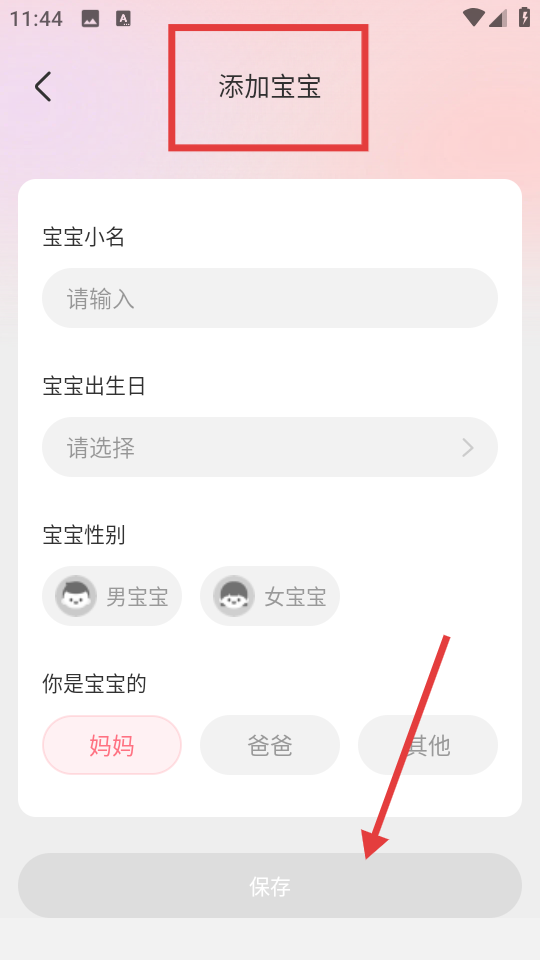 3、在添加寶寶頁面依次填寫二胎寶寶的小名,選擇出生日期、寶寶性別,并選擇自己與寶寶的關(guān)系,全部信息確認無誤后點擊保存按鈕,即可完成二胎信息的添加。