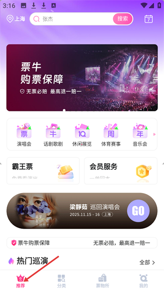 1、推薦頁面以上海為定位,有搜索欄,展示購票保障無票必賠,有演唱會(huì)等分類,推薦梁靜茹演唱會(huì)等熱門巡演。