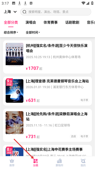 2、分類頁面以上海為定位,可搜演出,分類有演唱會(huì)等,展示杭州演唱會(huì)、上海鋼琴音樂會(huì)等演出及票價(jià)。