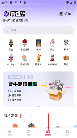 3、票物所頁面有盲盒、毛絨玩具等潮玩分類,提供票牛潮玩保障正品、鑒定、服務(wù)無憂,還有即將發(fā)售的潮玩推薦。