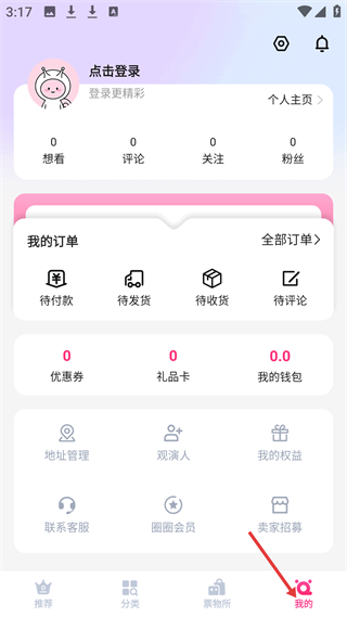 4、我的頁面可點(diǎn)擊登錄,想看、評(píng)論等數(shù)據(jù)為0,含我的訂單待付款等、優(yōu)惠券等功能,還有地址管理、聯(lián)系客服等服務(wù)入口。