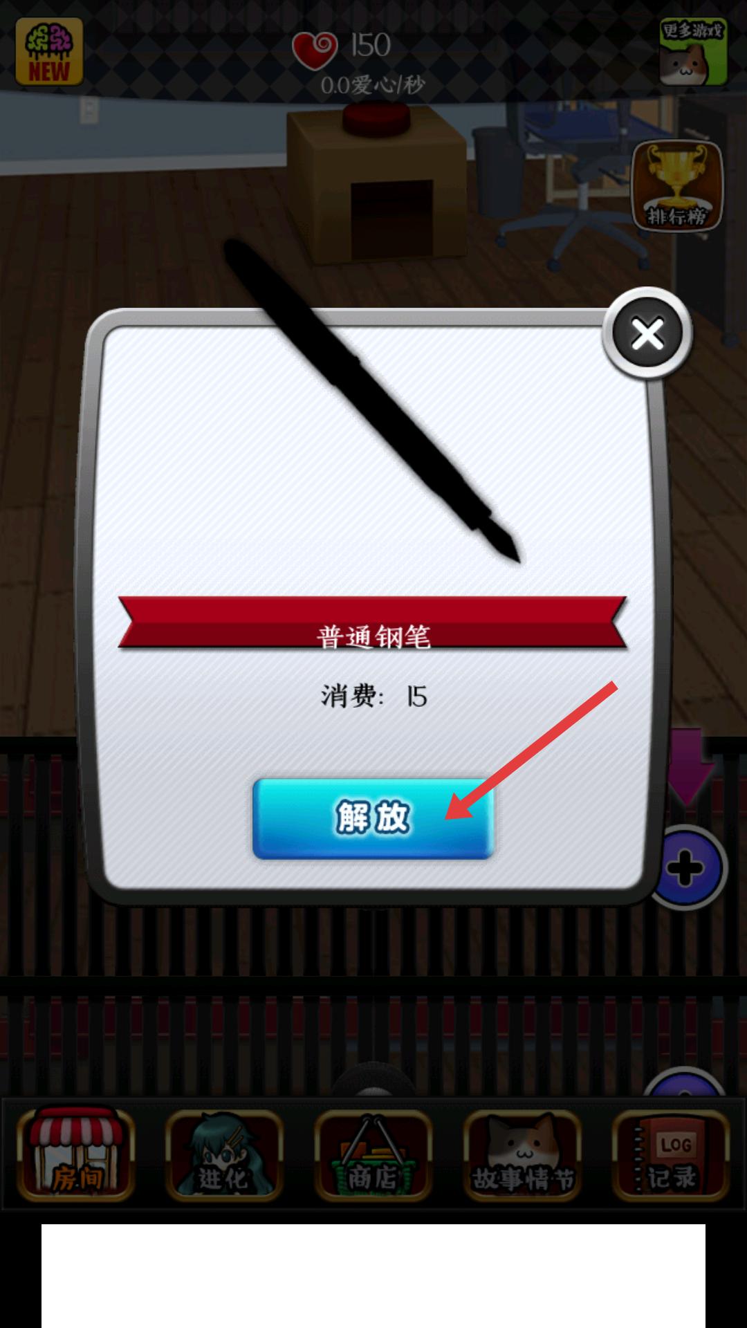 2、彈出普通鋼筆解鎖界面后,若愛心值足夠,點擊藍色解放按鈕,即可解鎖普通鋼筆,讓鋼筆加入游戲,可用于后續(xù)游戲操作。