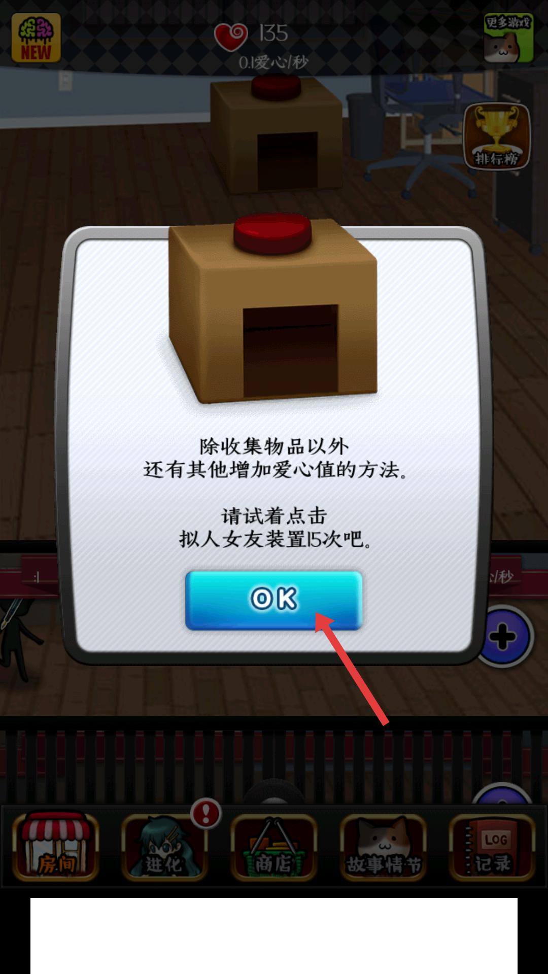 3、解鎖物品后,會彈出提示框,告知有其他增加愛心值的方法,點擊OK按鈕,關(guān)閉提示框,然后按照提示點擊擬人女友裝置15次,獲取愛心值。
