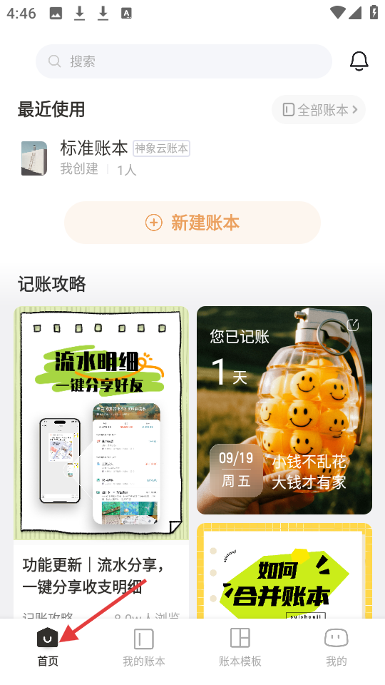1、首頁呈現(xiàn)最近使用賬本,設有新建賬本按鈕,搭配記賬攻略,分享記賬技巧與功能更新,助力用戶開啟記賬之旅。