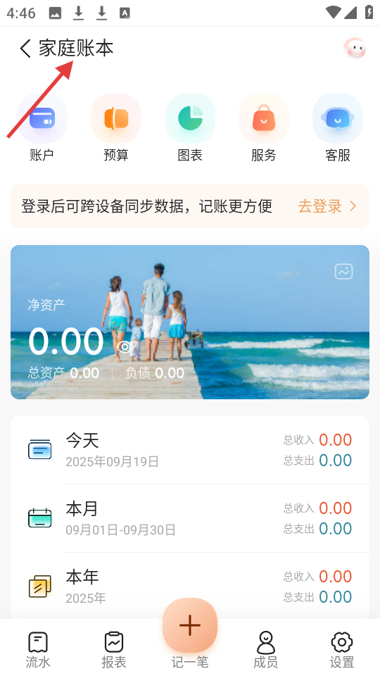 2、家庭賬本界面涵蓋賬戶、預算等功能,實時顯示資產(chǎn)與收支數(shù)據(jù),登錄后可跨設備同步,為家庭財務管理提供便利。