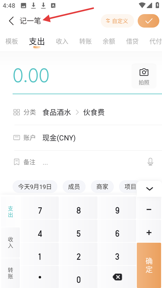 3、記一筆頁面專注賬務記錄,區(qū)分支出、收入等類型,分類詳盡且支持拍照等方式,滿足多樣化記賬需求。