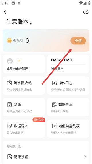 4、若需要充值在生意賬本相關頁面,找到充值按鈕,點擊該按鈕進入充值界面,選擇充值金額等,完成充值操作,以便使用更多增值功能。