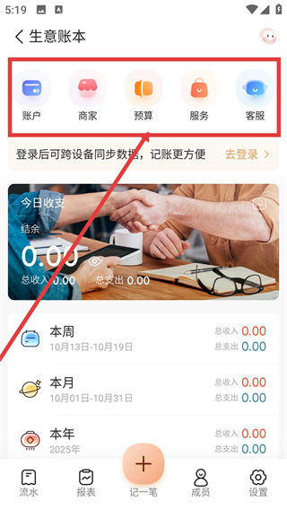 1、打開隨手記APP,進入生意賬本頁面,看到賬戶、商家、預算等功能入口,點擊預算,進入預算中心頁面,準備設置預算相關內(nèi)容。