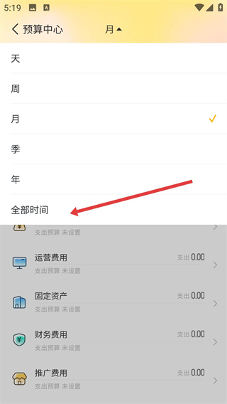 2、在預算中心頁面,看到頂部的時間選擇區(qū)域,點擊該區(qū)域,彈出時間選項,可選擇天、周、月、季、年或全部時間,方便查看不同時間段的預算情況。