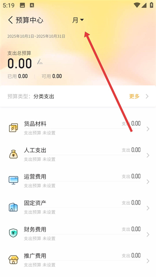 3、選擇好時間范圍后,在預算中心頁面可查看各類支出預算,如貨品材料、人工支出等,根據(jù)生意需求,對不同類別的支出預算進行設置。