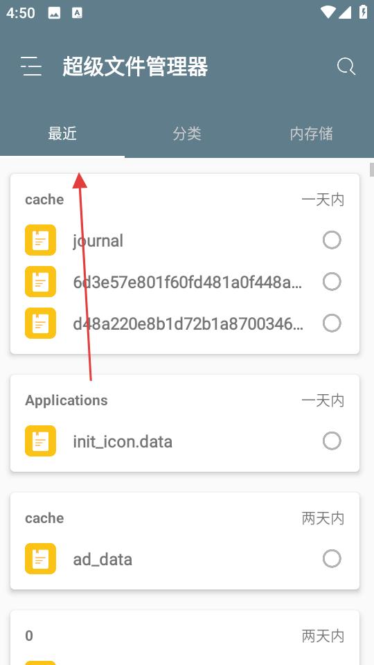 1、打開超級文件管理器,進入最近頁面,可查看近期訪問文件,瀏覽cache、Applications等文件夾及內部文件,快速找到剛操作過的文件內容。