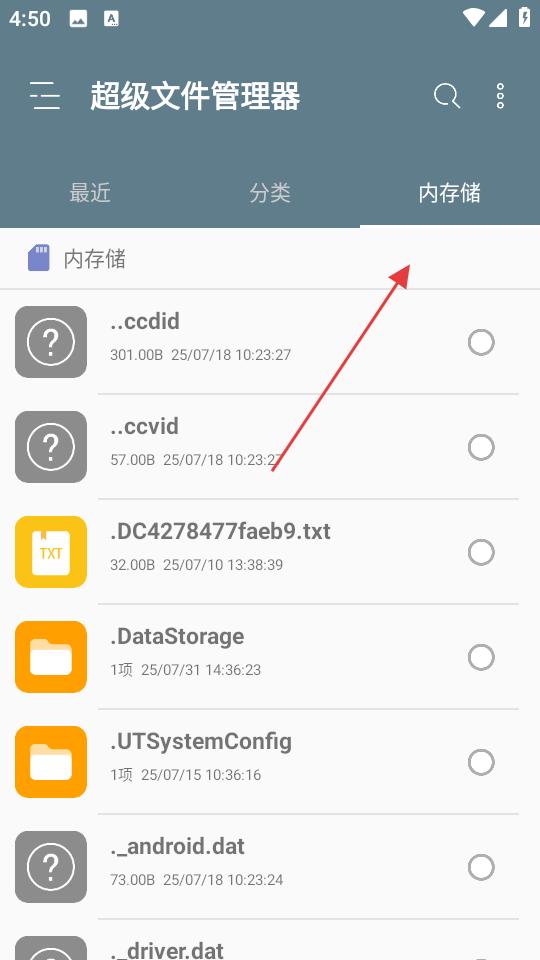 2、切換至內存儲頁面,查看手機存儲的各類文件,包括ccdid、DC4278477faeb9.txt等,按需選擇文件進行管理,如查看、移動或刪除。