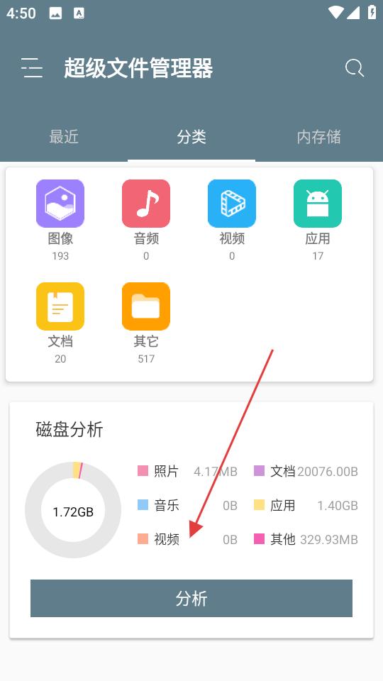 3、進入分類頁面,借助圖像、音頻等分類快速定位文件類型,點擊分析參與磁盤分析,了解照片、文檔、應用等占用存儲情況,優(yōu)化空間使用。