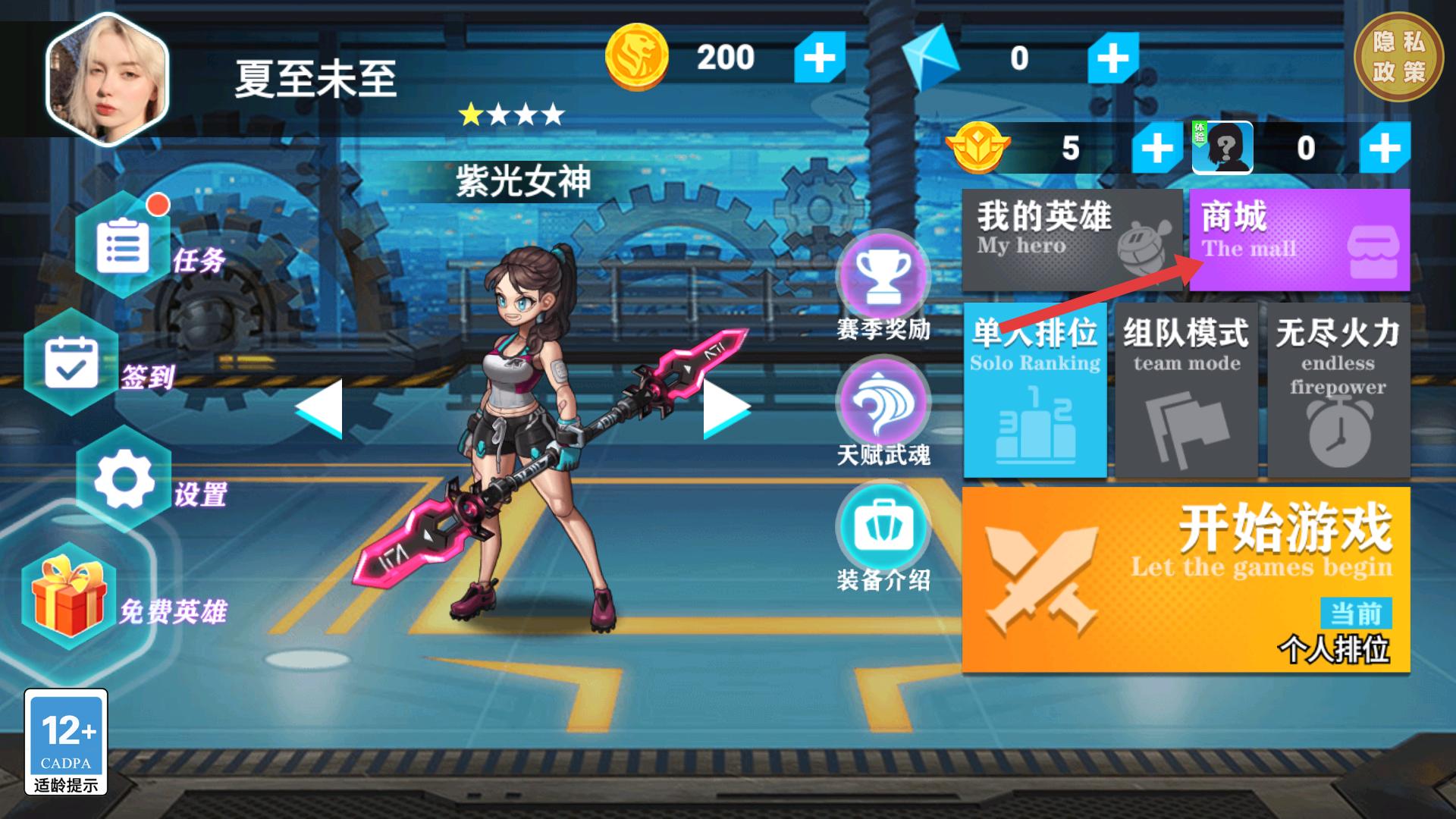 1、在主界面,若想獲取新英雄或道具,可點(diǎn)擊紫色的【商城】按鈕,進(jìn)入商城界面,查看各類可購買的物品。