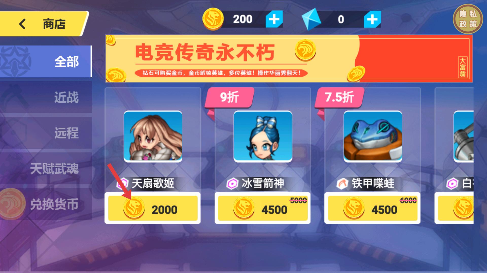 2、進(jìn)入商城后,能看到有不同英雄售賣,像【天扇歌姬】需2000金幣,若金幣足夠,點(diǎn)擊對應(yīng)購買按鈕即可獲得該英雄。
