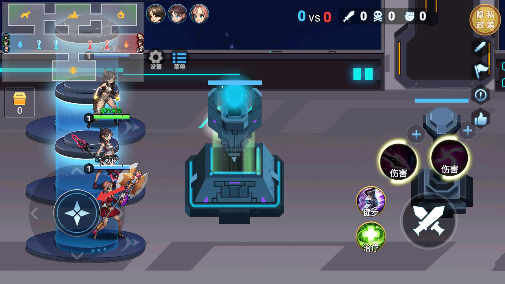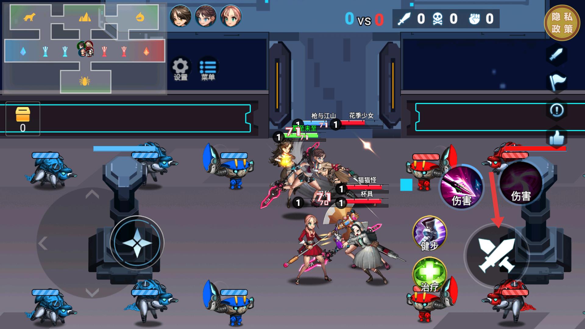 3、進(jìn)入戰(zhàn)斗后,可通過左側(cè)的移動按鈕操控英雄移動,右側(cè)有傷害、治療等技能按鈕,根據(jù)戰(zhàn)斗情況點(diǎn)擊釋放技能。