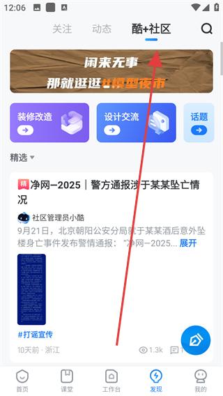 4、進(jìn)入酷社區(qū)頁(yè)面,可瀏覽裝飾改造、設(shè)計(jì)交流等板塊,查看精選話題和帖子,參與社區(qū)討論,獲取設(shè)計(jì)資源和交流機(jī)會(huì)。