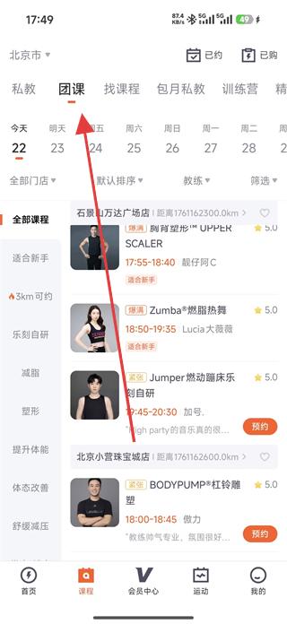 1、打開樂刻運動軟件,進入課程頁面,點擊團課選項,可看到不同門店的團課列表,如石景山區(qū)萬達廣場店的課程。