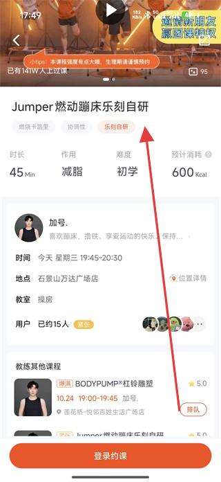 2、選擇心儀的團課,如Jumper燃動蹦床樂刻自研課程,點擊進入課程詳情頁,查看課程時長、作用、難度等信息。