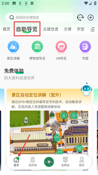 3、軟件首頁有自助導(dǎo)覽、古建世遺等欄目,還提供VR云游、每日一寶等多樣文旅功能,以及金牌講者人工精講內(nèi)容。