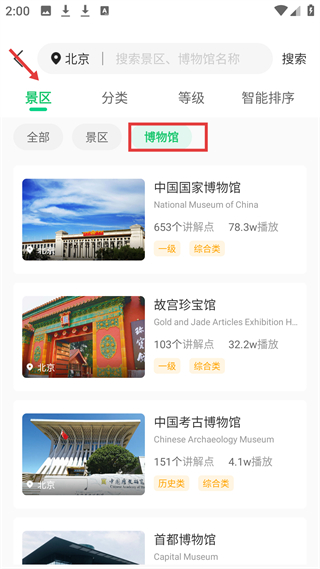 2、景區(qū)博物館分類頁定位北京,展示中國國家博物館、故宮珍寶館等博物館列表,標(biāo)注講解點數(shù)量和播放量,方便用戶選擇。