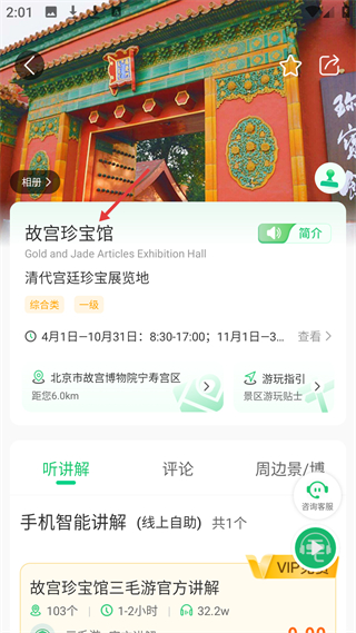 3、故宮珍寶館詳情頁介紹其為清代宮廷珍寶展覽地,展示開放時間、位置等,提供手機(jī)智能講解服務(wù),助力游客了解。