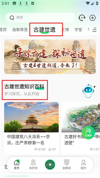 4、古建世遺板塊有尋蹤古建探秘世遺廣告,設(shè)古建知識百科板塊,展示中國建筑派系等內(nèi)容,豐富用戶古建文化認(rèn)知。