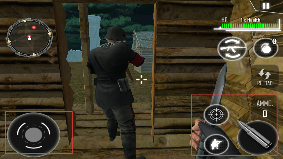 2、用左側(cè)虛擬搖桿控制移動(dòng),右側(cè)按鈕切換武器、進(jìn)行射擊等操作,在建筑內(nèi)或野外與敵人周旋,利用武器消滅敵人。