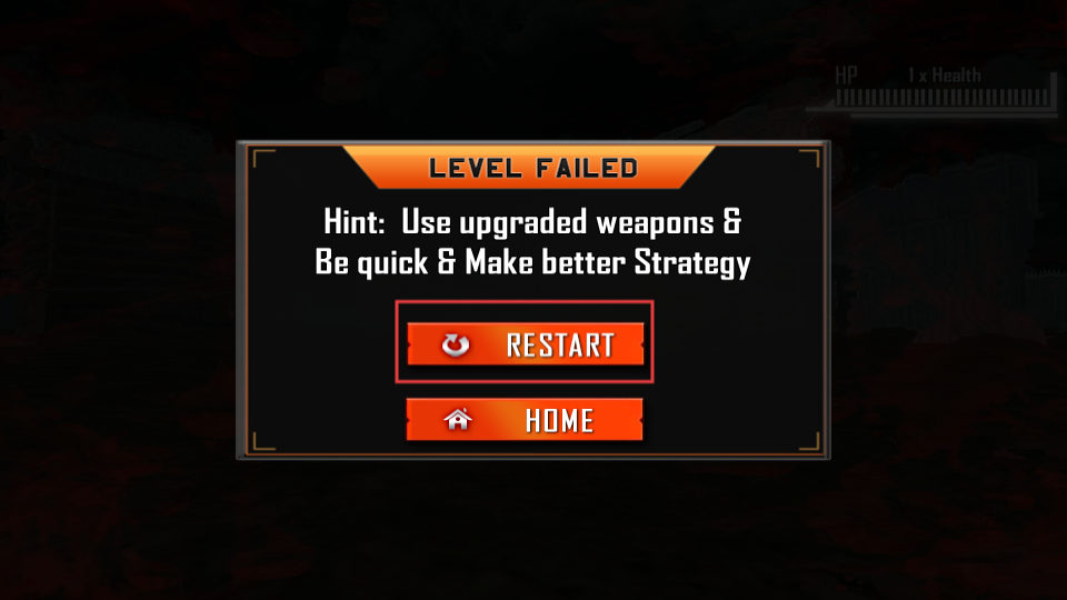 3、若關(guān)卡失敗,會(huì)出現(xiàn)提示,可點(diǎn)擊RESTART重新開(kāi)始本關(guān)卡,根據(jù)提示升級(jí)武器、制定更好策略,再次挑戰(zhàn),也能返回主頁(yè)。