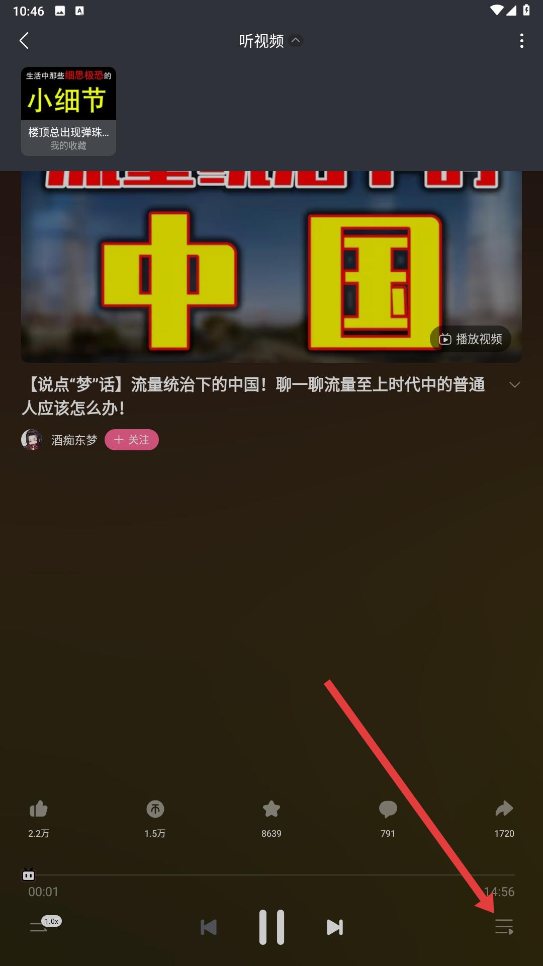 3、聽視頻界面,點(diǎn)擊右下角的播放列表圖標(biāo),可查看正在播放和歷史播放的視頻列表。