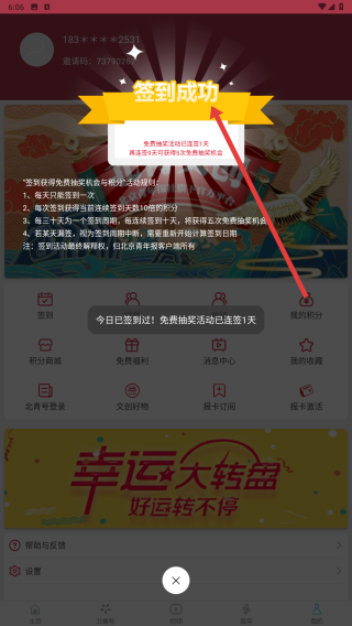 2、點擊簽到后,會顯示簽到成功,還可了解簽到相關(guān)規(guī)則,如連續(xù)簽到有獎勵等。
