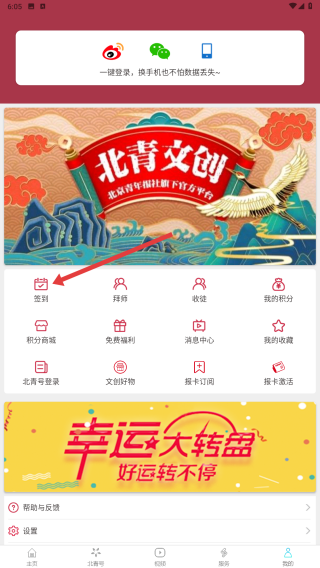 1、打開北青相關(guān)APP,在首頁可看到北青文創(chuàng)板塊,還有簽到、搖獎等功能入口,點擊簽到可參與簽到活動。