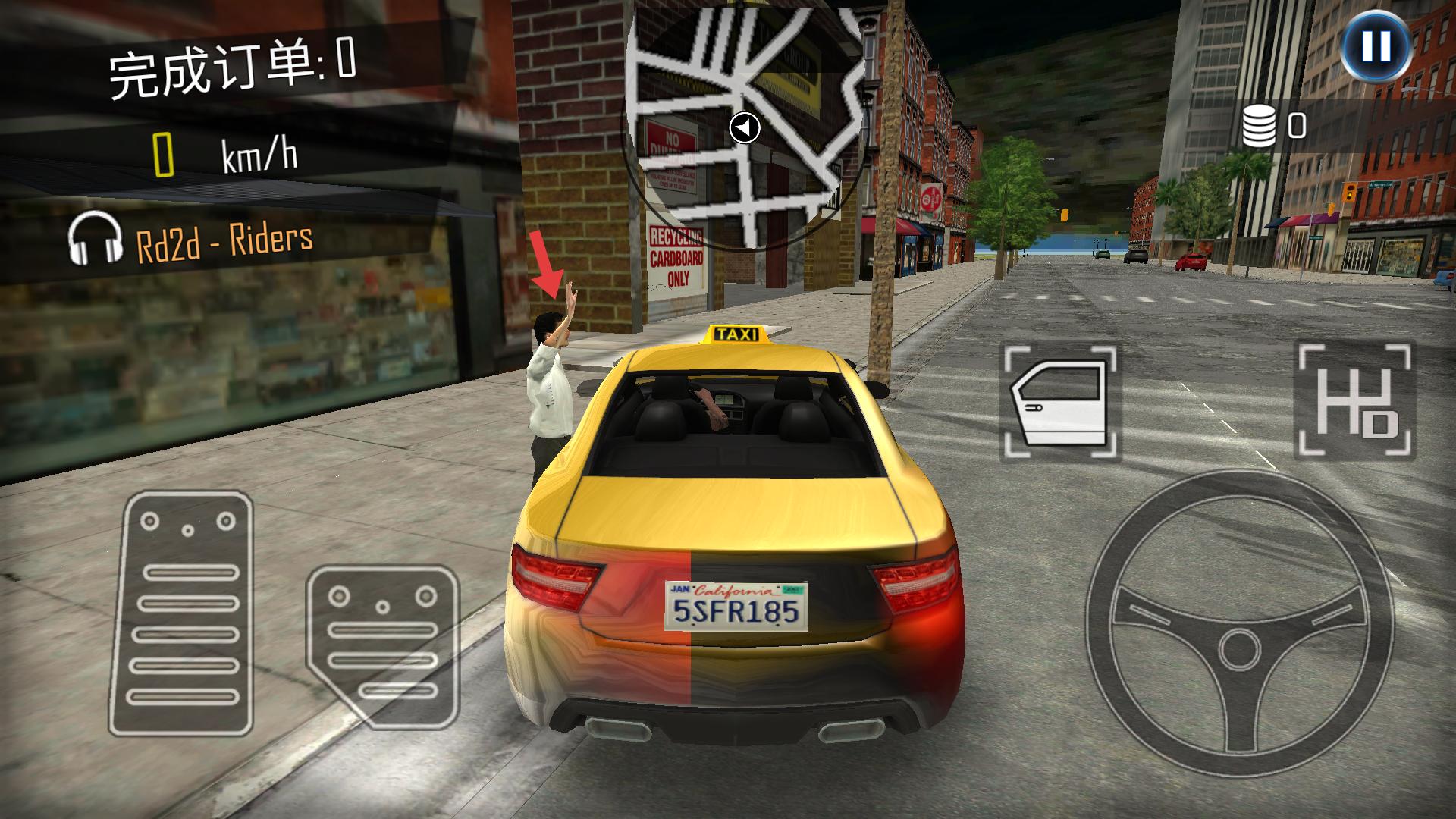4、駕駛出租車到街道上,看到招手的乘客,將車停靠在其附近,準備接送乘客,完成訂單任務。