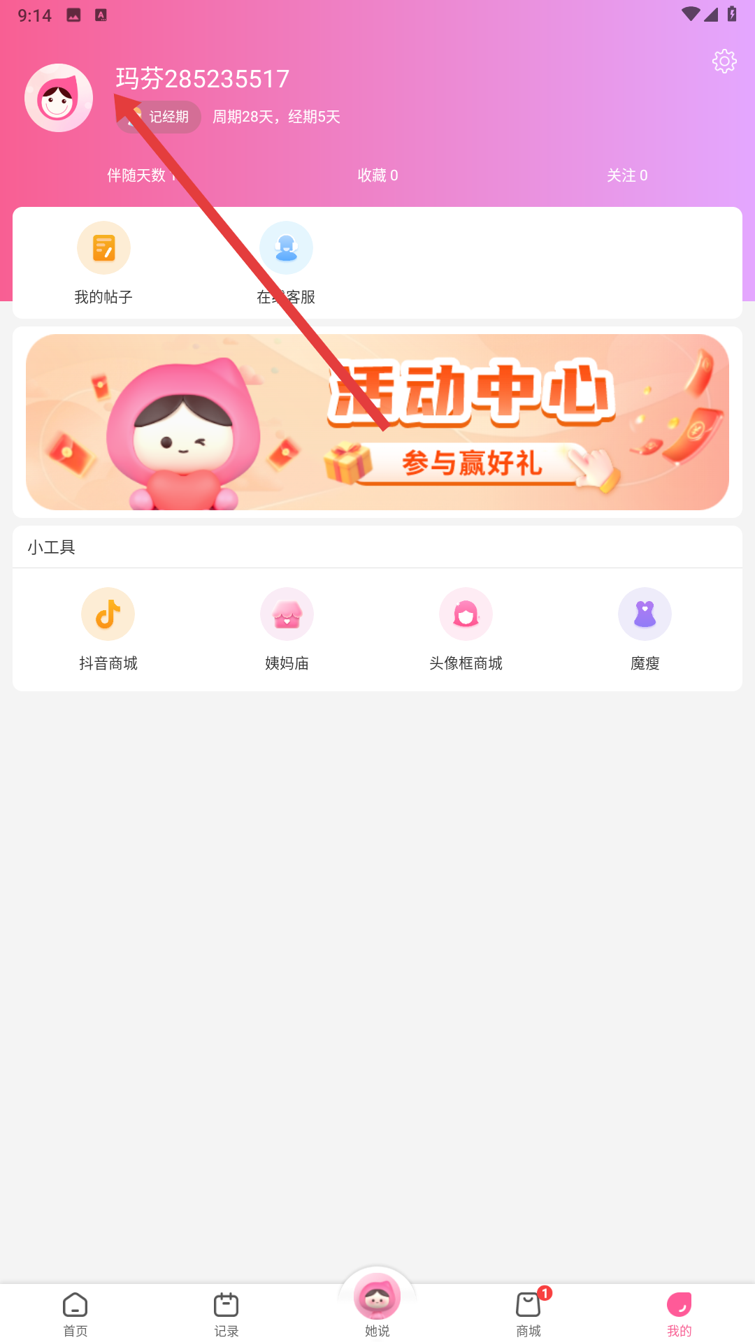 4、完成上述操作后,進入個人頁面,點擊頭像可查看個人信息及經(jīng)期記錄情況,也可該頁面使用小工具。