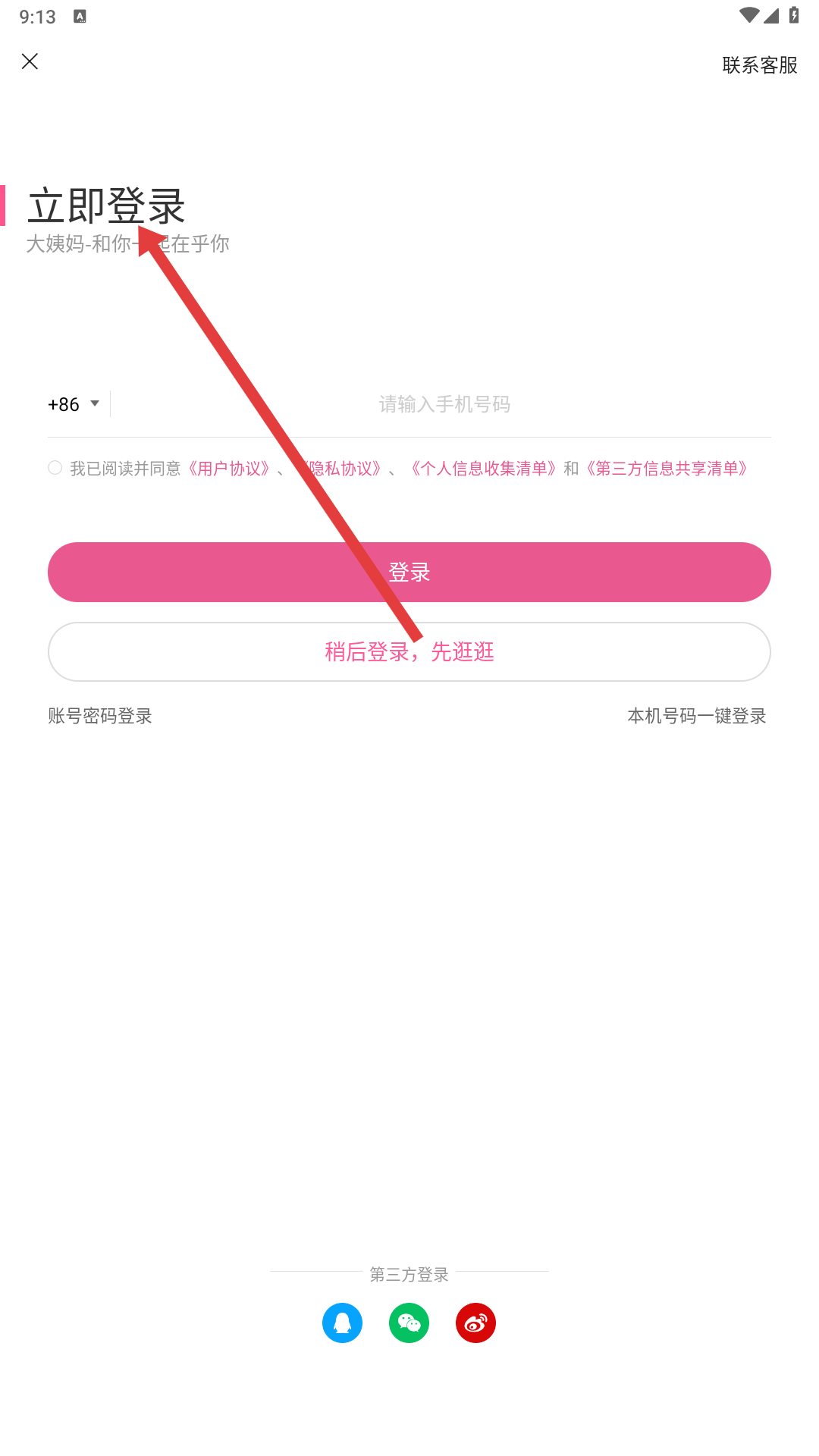 1、打開大姨媽APP,進入立即登錄頁面,輸入手機號碼,勾選同意相關協(xié)議選項,點擊登錄按鈕,若不想立即登錄可選擇稍后登錄先逛逛選項。