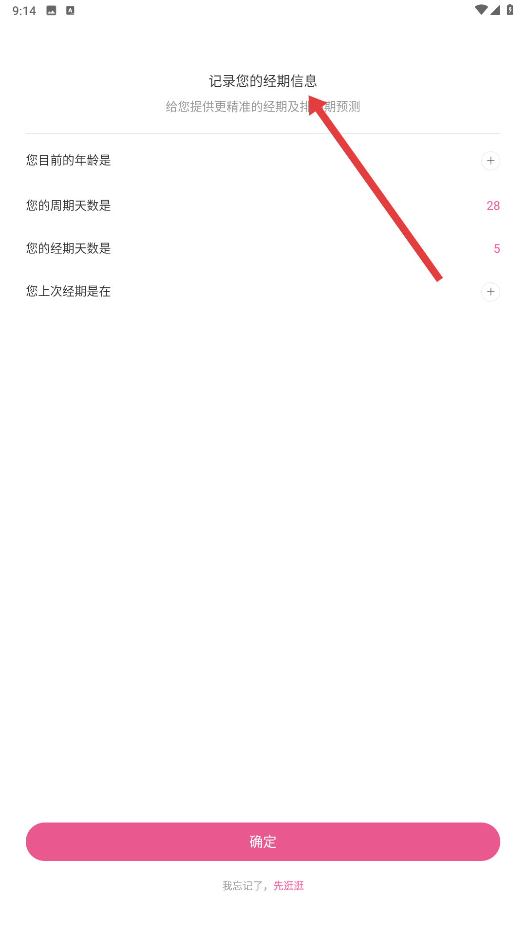 3、進入記錄您的經(jīng)期信息頁面,點擊年齡、上次經(jīng)期對應的加號按鈕,分別輸入您目前的年齡和上次經(jīng)期時間,周期天數(shù)和經(jīng)期天數(shù)可根據(jù)實際情況確認是否修改。