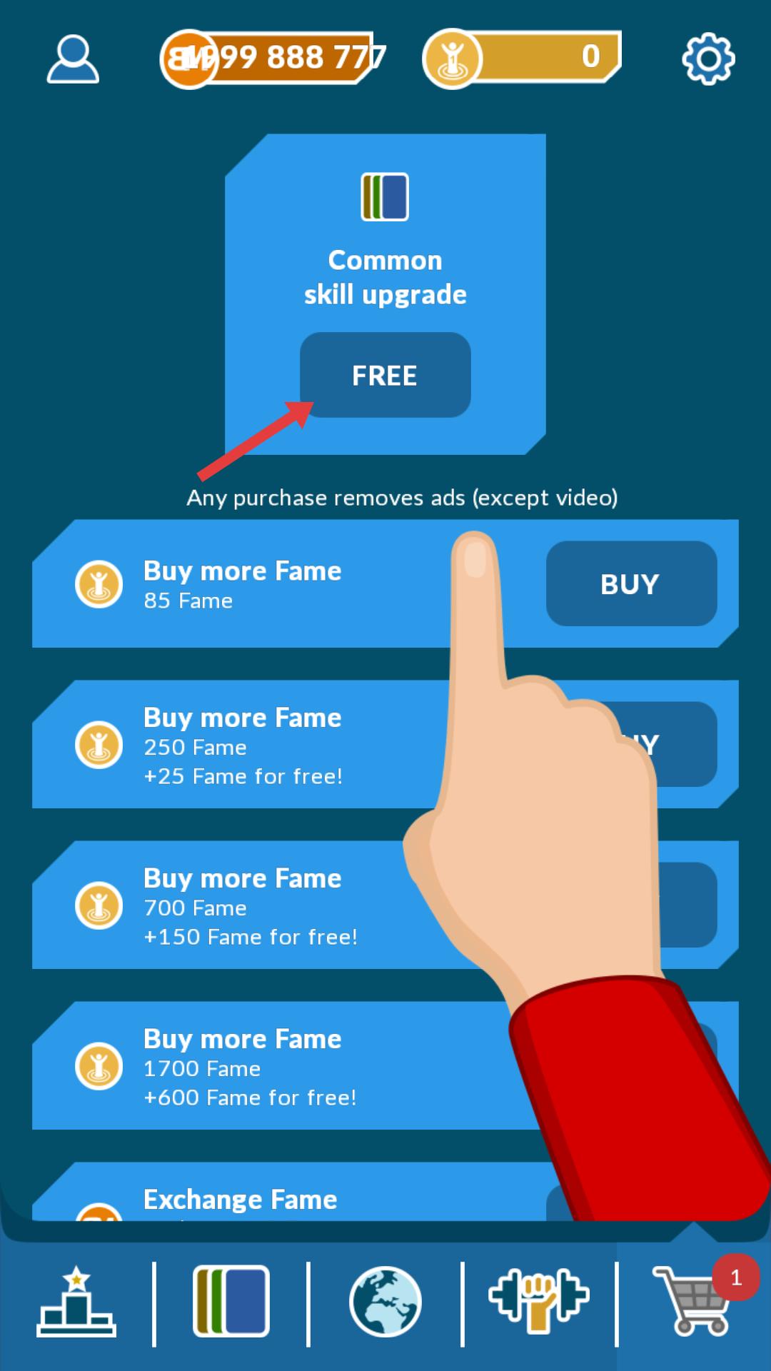 1、在技能升級(jí)界面,點(diǎn)擊【Common skill upgrade】下的FREE按鈕,可免費(fèi)升級(jí)通用技能,提升角色能力,且任意購(gòu)買可移除廣告。