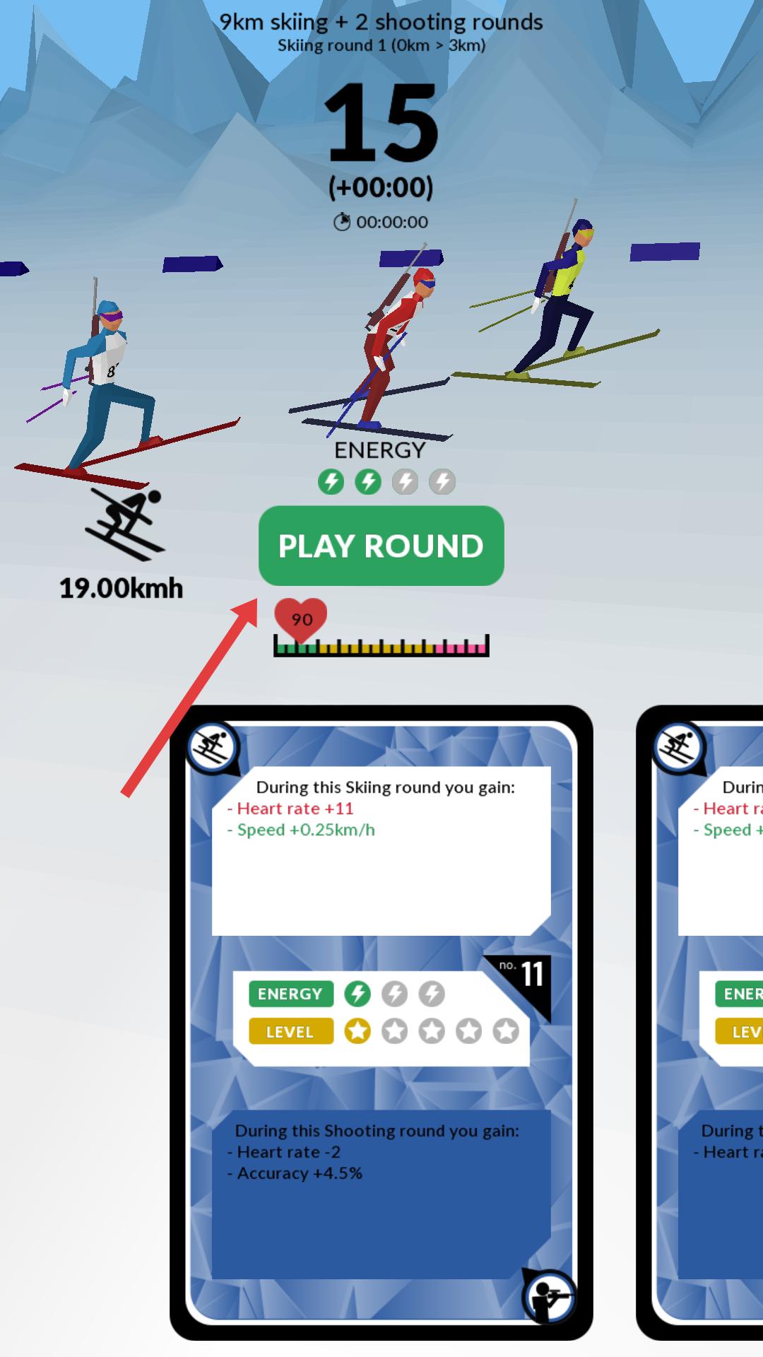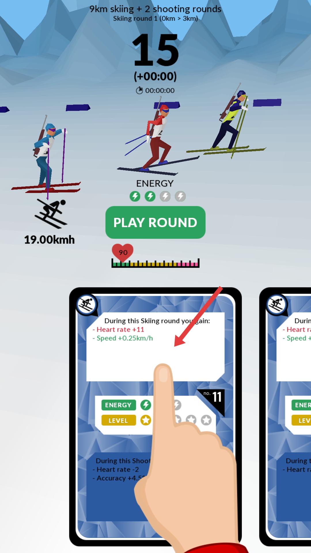 4、滑雪輪次中,關(guān)注卡片上顯示的心率、速度等增益效果,利用這些效果提升滑雪表現(xiàn),為后續(xù)射擊環(huán)節(jié)打好基礎(chǔ)。