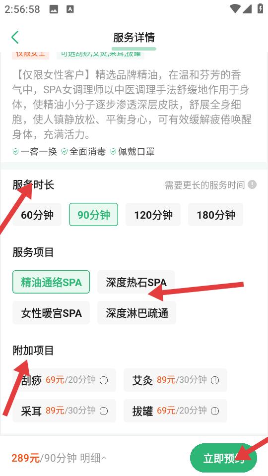 3、服務(wù)詳情頁(yè)介紹精油SPA限女性客戶,服務(wù)時(shí)長(zhǎng)可選90分鐘等,項(xiàng)目含精油通絡(luò)SPA,附加項(xiàng)有刮痧,底部標(biāo)289元90分鐘,綠色立即預(yù)約按鈕方便下單。