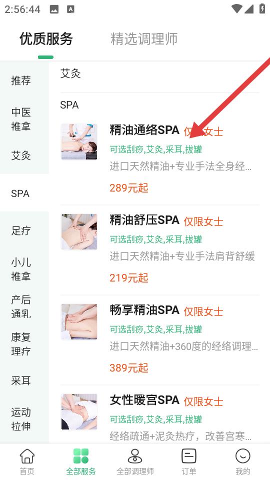 2、列表展示精油通絡(luò)SPA標(biāo)注僅限女士,可選刮痧等附加項(xiàng),介紹進(jìn)口精油加專(zhuān)業(yè)手法,289元起,幫助用戶選擇適合的SPA服務(wù)。