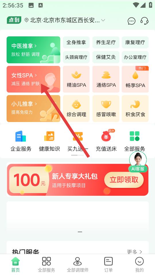 1、首頁(yè)分類(lèi)清晰女性SPA板塊標(biāo)減壓通絡(luò)護(hù)膚,周?chē)兄嗅t(yī)推拿等服務(wù),下方新人專(zhuān)享100元禮包,引導(dǎo)用戶進(jìn)入女性SPA服務(wù)頁(yè)面挑選項(xiàng)。