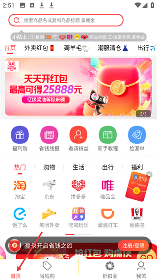 1、首頁板塊有搜索欄可查商品拿傭金,還有福利購、省錢線報等功能,聚合淘寶、京東等平臺及外賣、出行服務(wù),登錄可開啟省錢之旅。