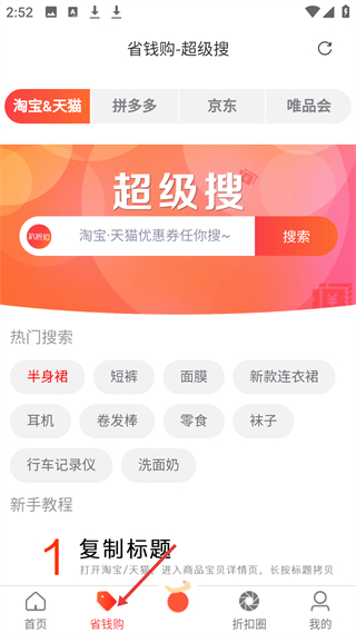 2、省錢購板塊超級搜,可搜淘寶、天貓優(yōu)惠券,有熱門搜索分類如半身裙、耳機(jī)等,新手可按教程復(fù)制標(biāo)題領(lǐng)優(yōu)惠。