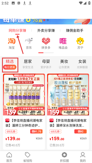 3、網(wǎng)購分享賺板塊,有淘寶、京東等平臺入口,精選每日更新商品,如潘婷洗護(hù)套裝,可領(lǐng)券優(yōu)惠,還能賺傭金。