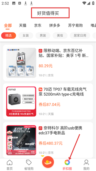 4、折扣圈板塊好貨值得買,聚合天貓、京東等平臺商品,如美孚機(jī)油、車載充氣泵等,提供優(yōu)惠價格,助力用戶選購高性價比好物。