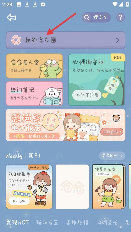 2、點(diǎn)擊我的念友圈突出,含念念名人堂等板塊,設(shè)手帳周刊及玩法專區(qū),呈現(xiàn)豐富手帳相關(guān)內(nèi)容。