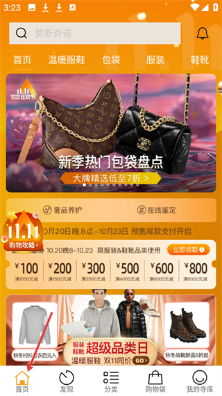 1、首頁(yè)雙11狂歡節(jié),新季熱門(mén)包袋大牌低至7折,有奢品養(yǎng)護(hù)、在線鑒定服務(wù),服裝鞋靴超級(jí)品類日活動(dòng)。