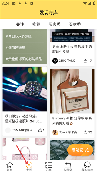 2、發(fā)現(xiàn)頁(yè)有關(guān)注、推薦板塊,有今日l(shuí)ook多少錢(qián)等話題,還有雷米格手表、Burberry包袋等奢品內(nèi)容,可發(fā)筆記互動(dòng)。