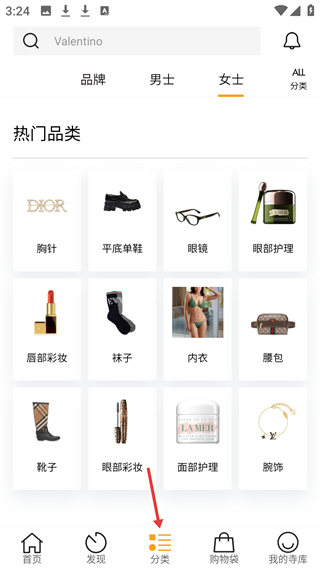 3、分類頁(yè)女士板塊,熱門(mén)品類有胸針、平底單鞋、眼鏡等,涵蓋美妝、服飾、配飾,分類清晰方便選購(gòu)奢品。