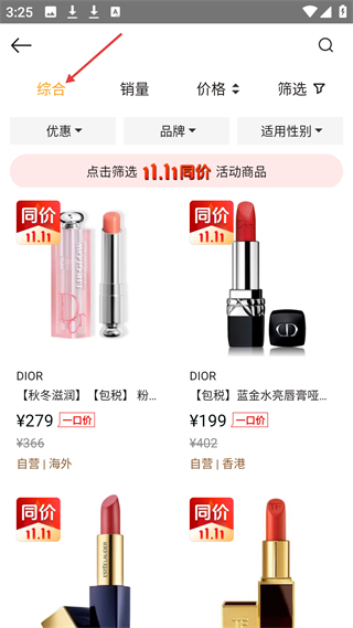 4、電商口紅頁(yè)綜合排序展示DIOR、雅詩(shī)蘭黛等品牌口紅,參與雙11同價(jià)活動(dòng),價(jià)格優(yōu)惠,標(biāo)注自營(yíng)海外或香港渠道。